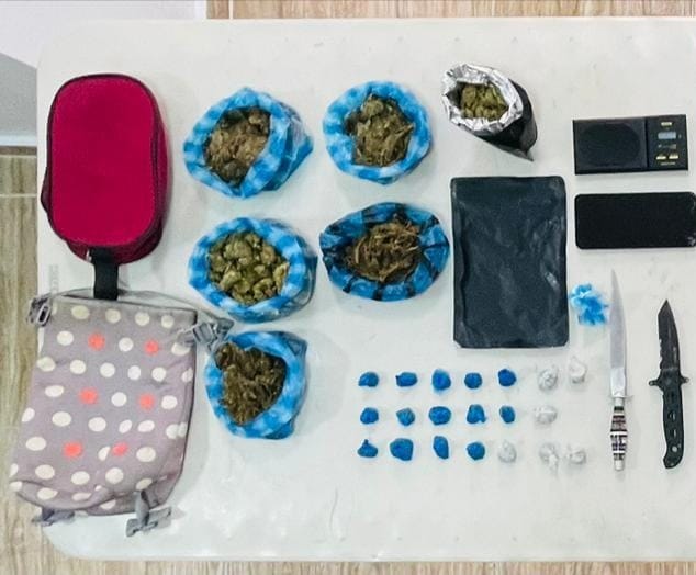 También se le encontraron tres porciones de un vegetal presumiblemente marihuana, y tres porciones de un polvo blanco, presumiblemente cocaína.
